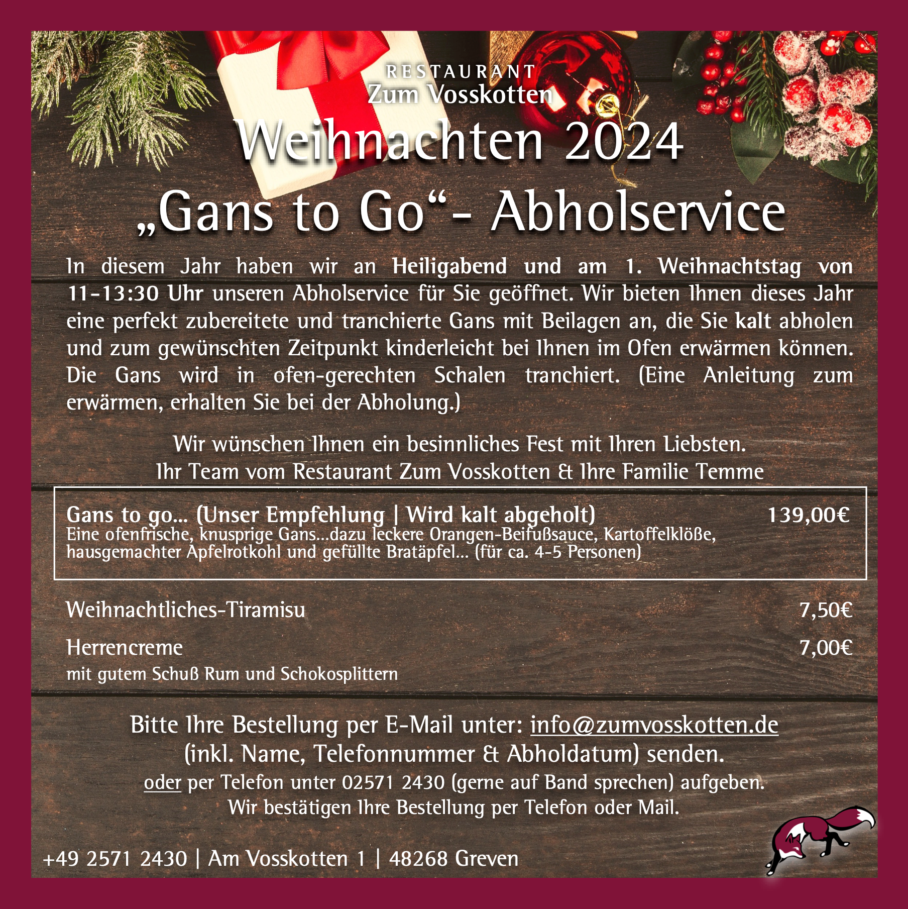 oder per Telefon unter 02571 2430 (gerne auf Band sprechen) aufgeben.